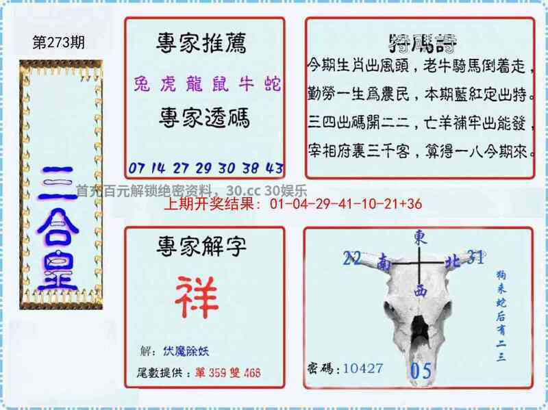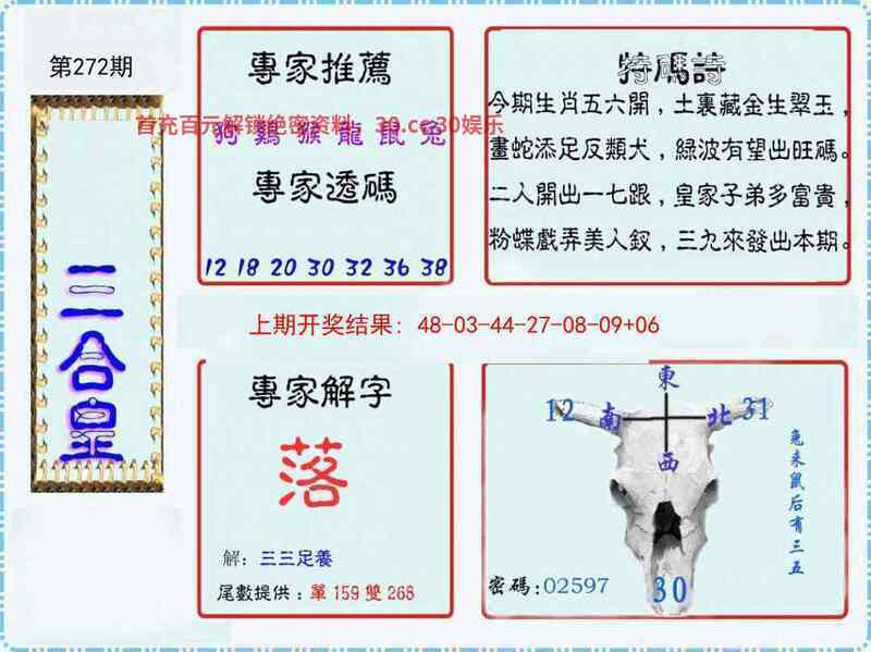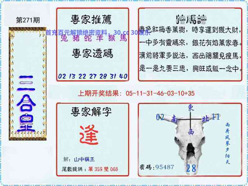 【解三合皇图】开:虎04 273期特码诗:今期生肖出風頭,老牛騎馬倒着走,勤勞一生為農民,本期藍紅定出特。三四出碼開二二,亡羊補牢出能發,宰相府裏三千客,算得一八今期來。 【专家推荐】兔虎龙鼠牛蛇 ![]() |